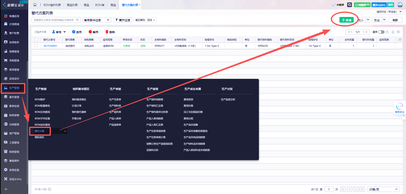 ① 在【生产管理】-【替代方案】里设置替代方案,点击新增