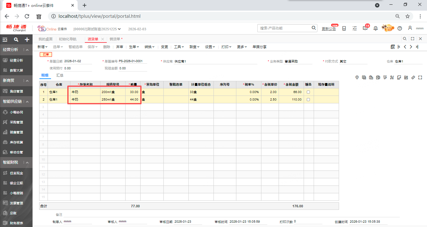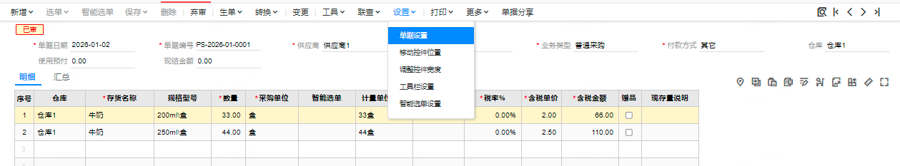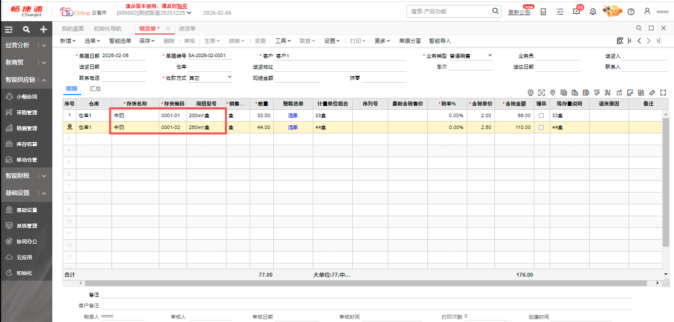 比如这里复制了规格为250ml/盒、200ml/盒的牛奶,在另一张单据中粘贴之后,带出的却都是200ml/盒规格的牛奶