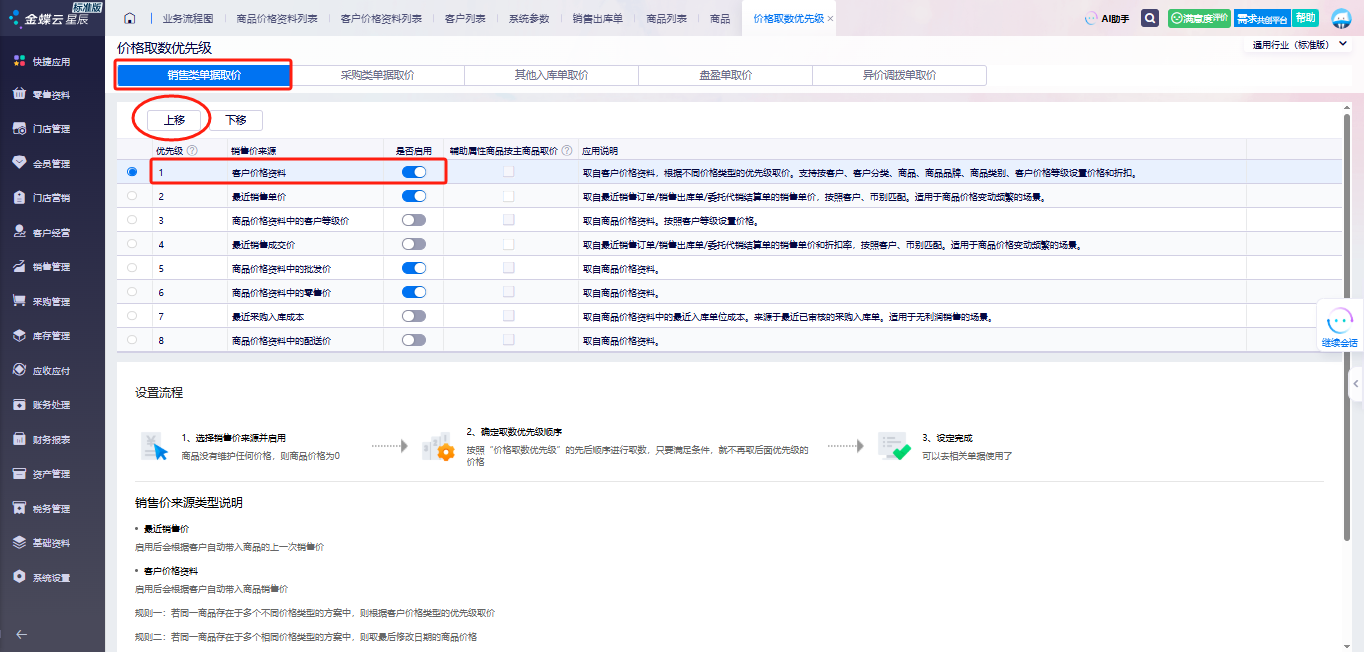 如果做销售单据的时候,未带出预先设置的价格,需进入【基础资料】-【价格取数优先级】检查是否将【客户价格资料】启用并且放在第一位。