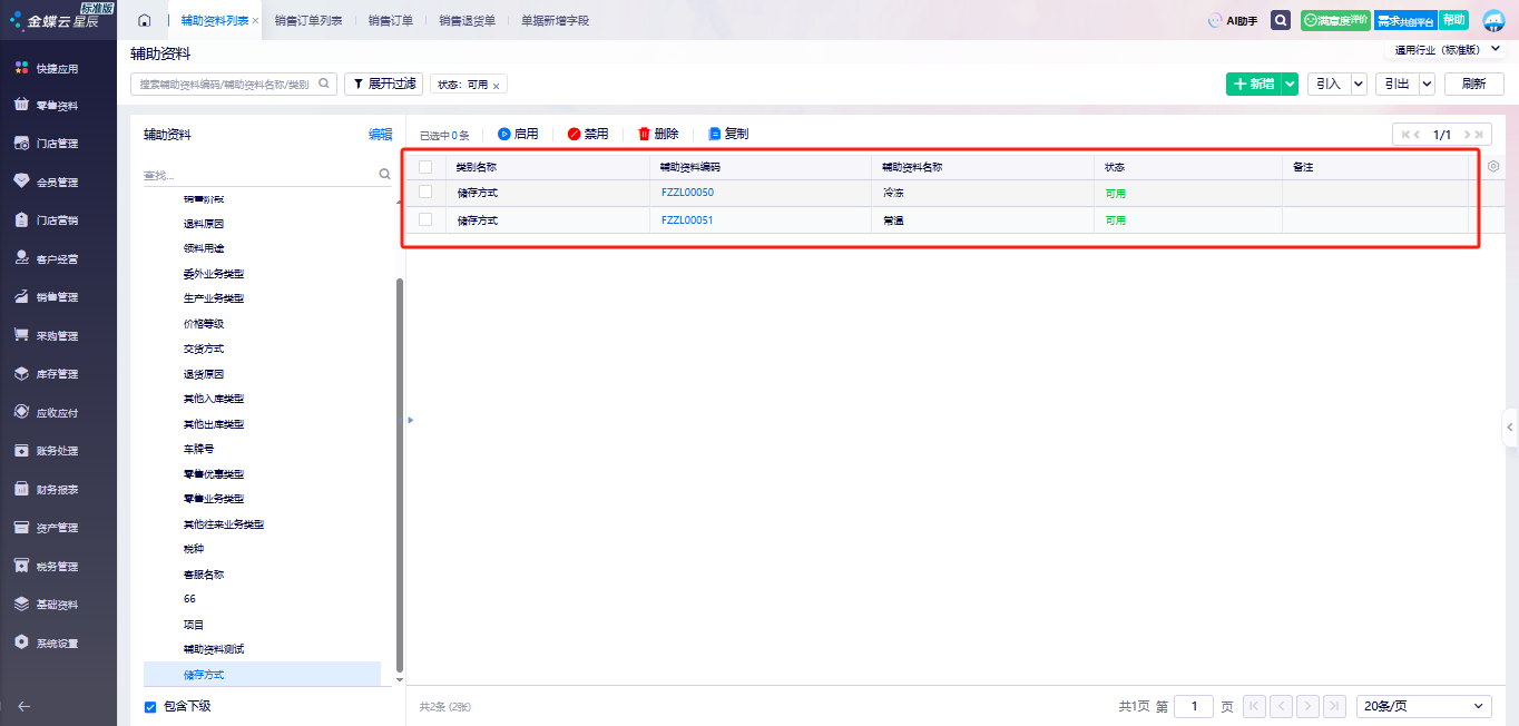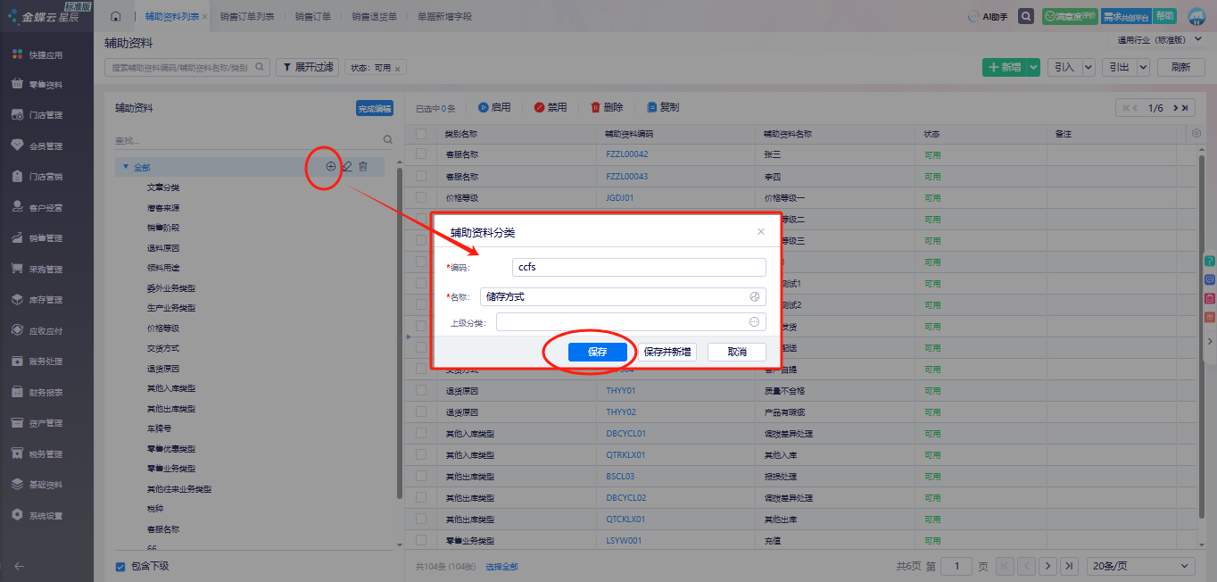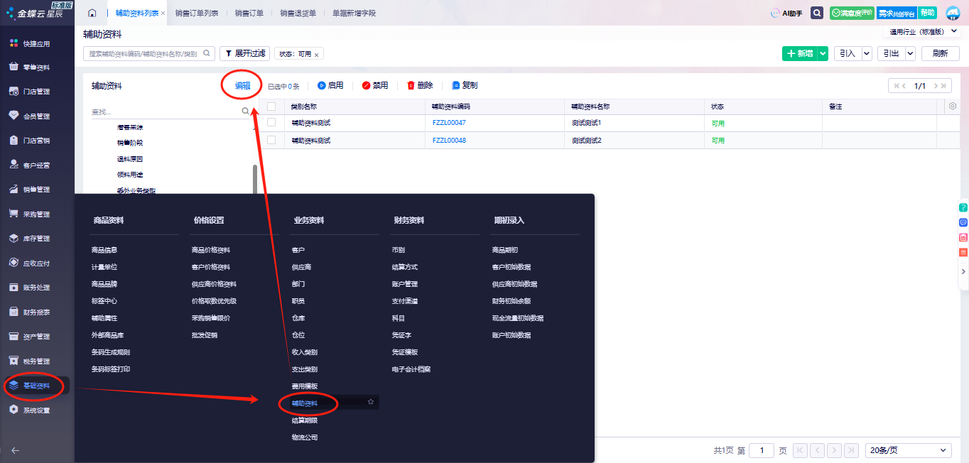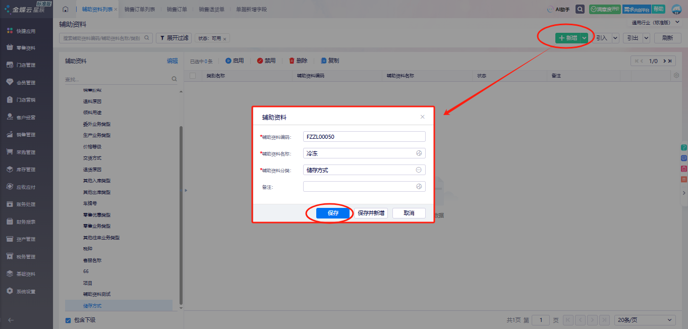 首先,进入【基础资料】--【辅助资料】点击左边的编辑,增加一个存储方式,如下图操作: