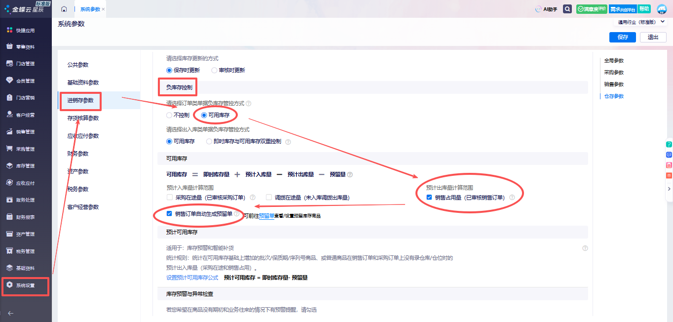 一、打开金蝶软件【系统设置】-【系统参数】-【进销存参数】,将“负库存控制”设为“可用库存”,并在“可用库存”选项里勾选“已审核销售订单”作为预计出库量后,系统会自动启用“销售订单预留”功能。