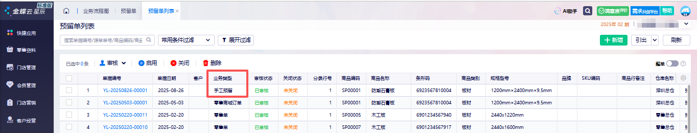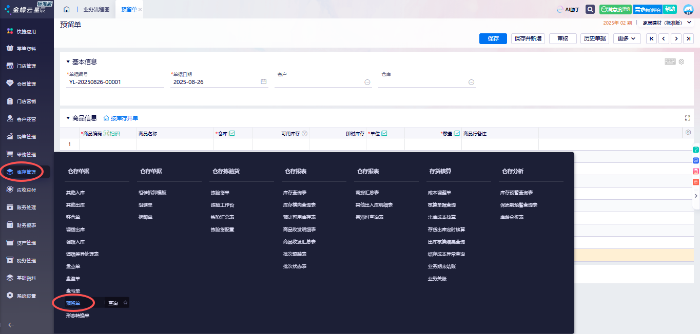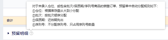 预留单仓库为必录项,也支持按批次、保质期、序列号总量、明细预留