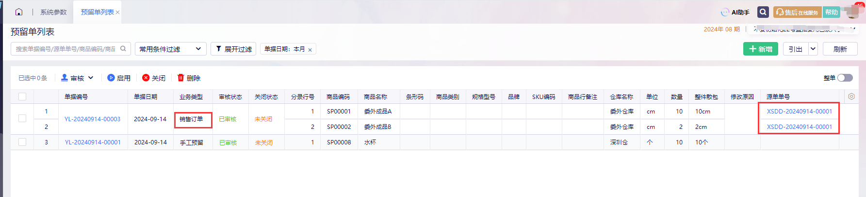系统支持通过销售订单,自动生成预留单,也可以手动新增。预留单中的商品就会自动在可用库存中扣除。手动关闭或删除预留单后,可用库存恢复,或销售订单生成的预留单,在销售订单执行完后,预留单也会删除。