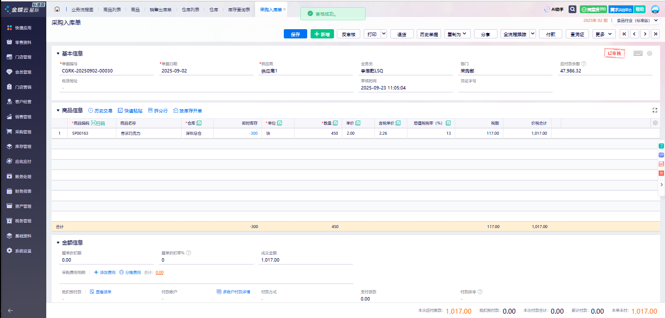 周六上午,老林把采购450块库存录入,系统立刻更新:当前库存= - 300(负库存) + 450(采购) = 150块,负库存直接抵消。