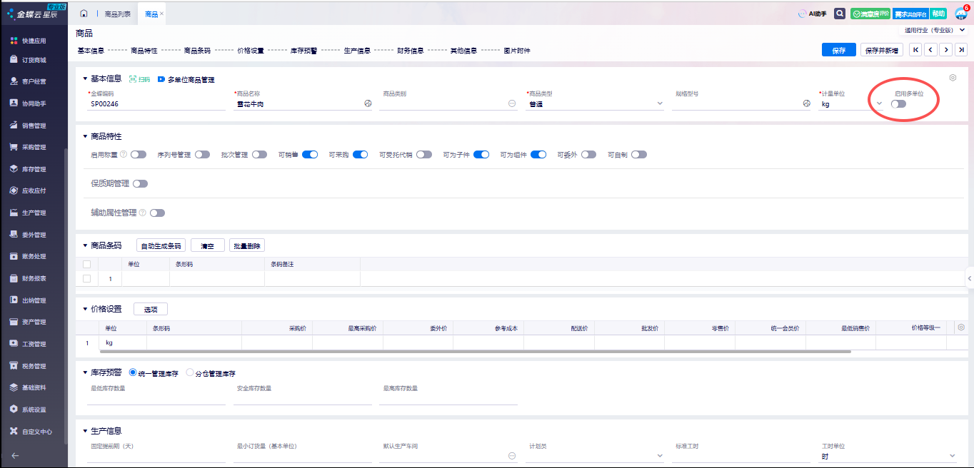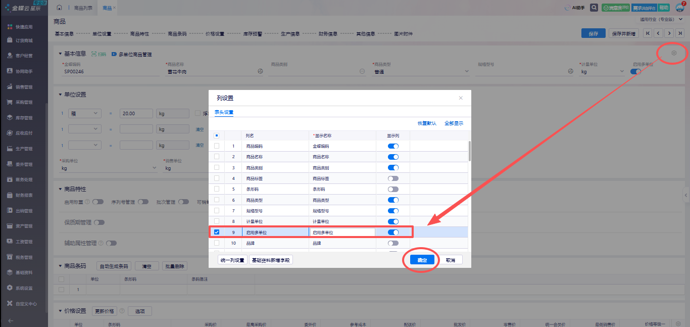 * 如果没有 “开启多单位”选项,在这里设置显示