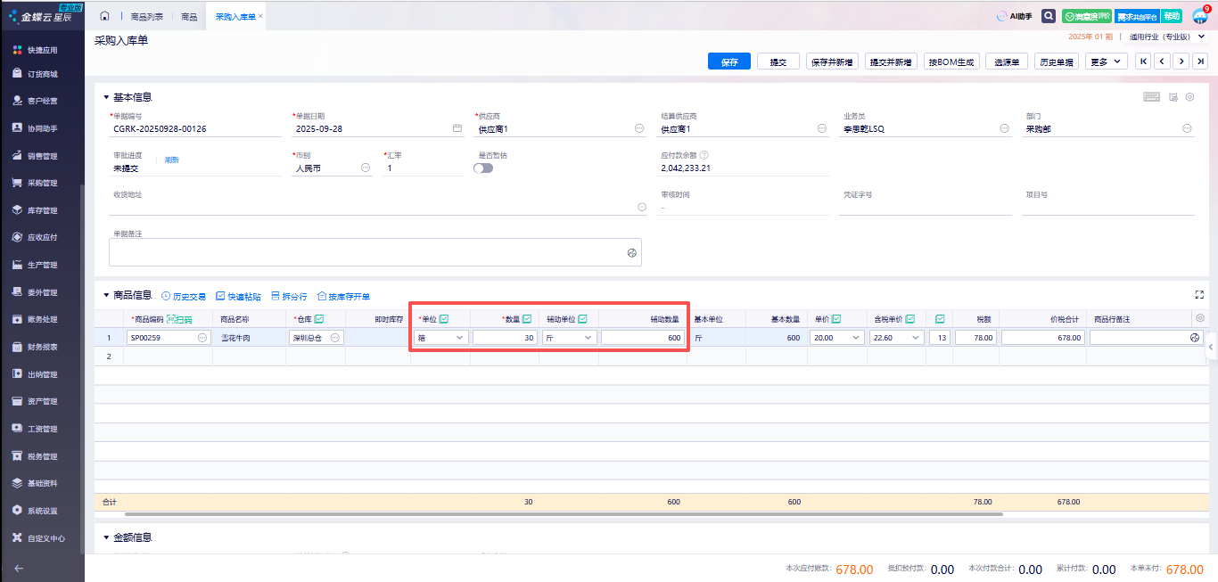 输入单位“箱”,数量30,自动弹出 基本单位600斤。
