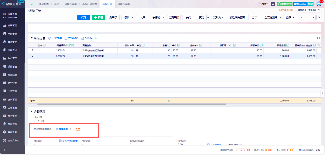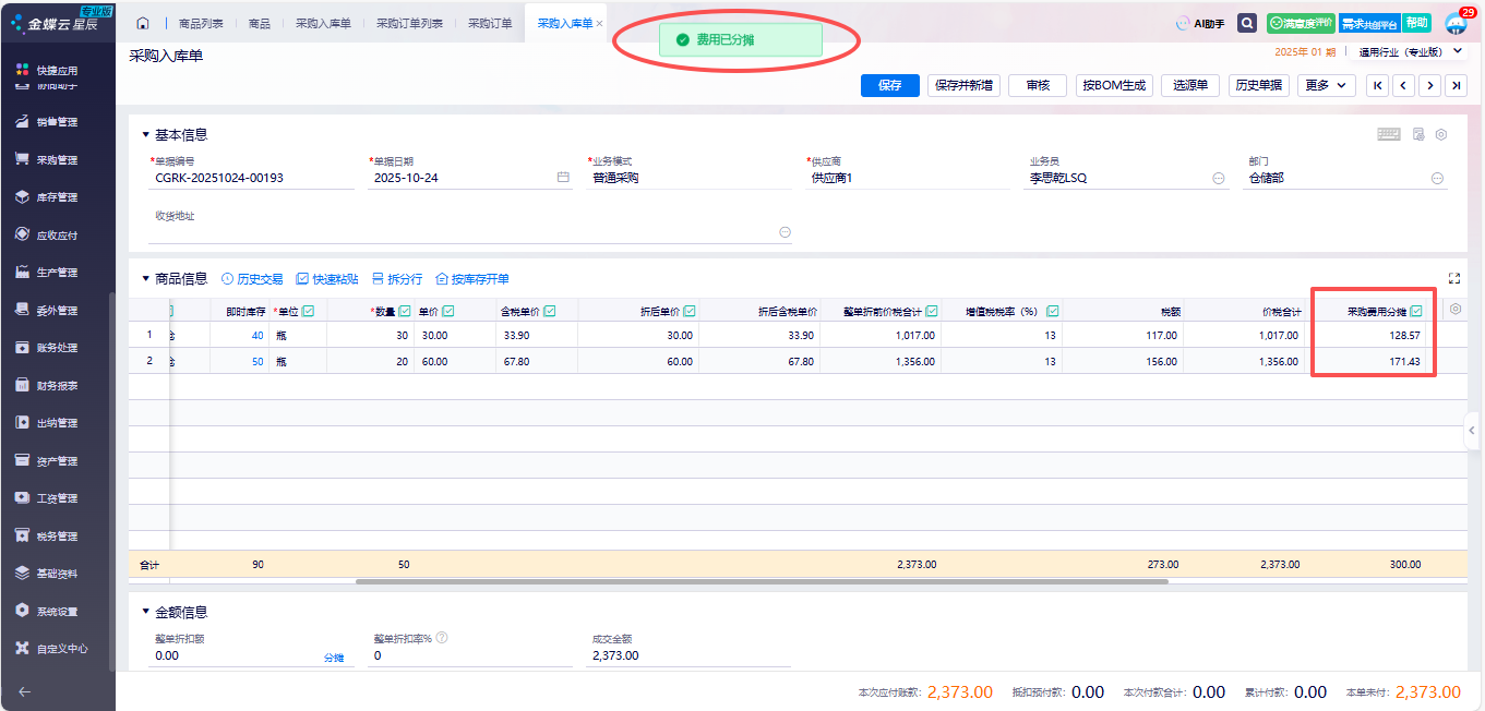 1.金蝶云星辰采购订单下推采购入库单,采购订单上已录入相应的【预计采购费用明细】,在采购入库单上费用明细内勾选【按源单分摊】可以正常进行费用分摊。