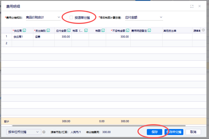 当费用明细内勾选【按源单分摊】时,不允许新增费用明细行,需要与采购入库单关联的源单上的费用明细保持一致。