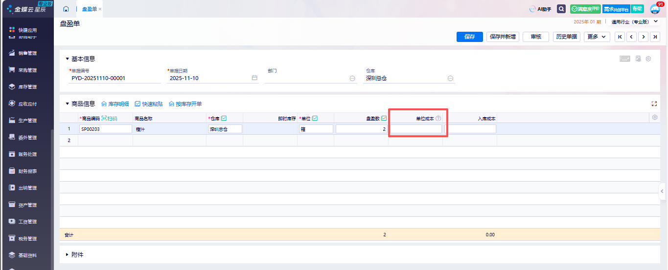 金蝶云星辰可直接在盘盈单中录入商品成本