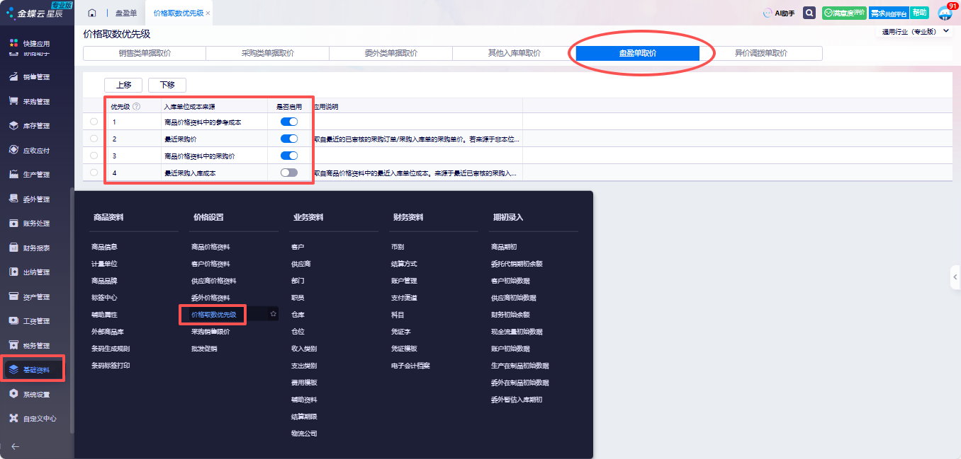 在【基础资料】-【价格取数优先级】-【盘盈单取价】中,可以设置自动带出价格。
