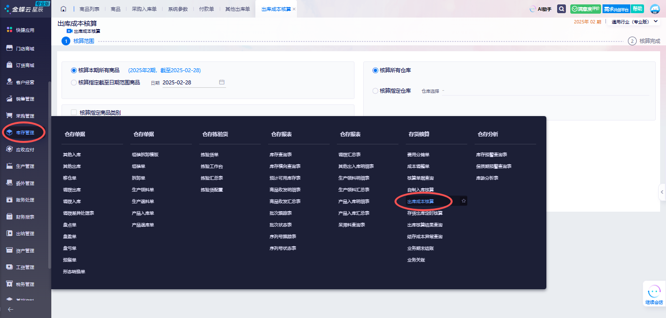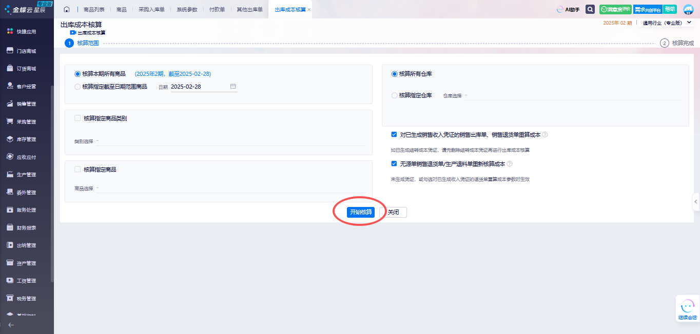 金蝶软件可以选择计算全部商品、全部仓库,点击【开始核算】。